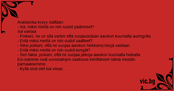 Arabipoika kysyy isältään: - Isä, miksi meillä on niin oudot päähineet? Isä vastaa: - Poikani, ne on sitä varten että suojaudutaan aavikon kuumalta auringolta. - Entä miksi meillä on niin oudot vaatteet? - Siksi poikani, että ne suojaa aavikon hiekkamyrskyjä vastaan. - Entä miksi meillä on niin oudot kengät? - Sen takia, poikani, että ne suojaa jalkoja aavikon kuumalta hiekalta. Esi-isämme ovat vuosisatojen saatossa kehittäneet nämä meidän parhaaksemme. - Kyllä sinä olet isä viisas. Mutta miksi me sitten asutaan Kontulassa