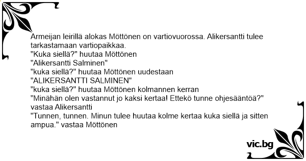"Tunnen, tunnen. Minun tulee huutaa kolme kertaa kuka siellä ja sitten ampua." vastaa Möttönen