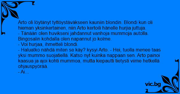Arto oli löytänyt tyttöystäväkseen kauniin blondin. Blondi kun oli hieman yksinkertainen, niin Arto kertoili hänelle hurjia juttuja.