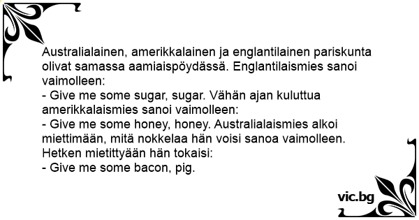 Australialainen, amerikkalainen ja englantilainen pariskunta olivat samassa aamiaispöydässä. Englantilaismies sanoi vaimolleen: