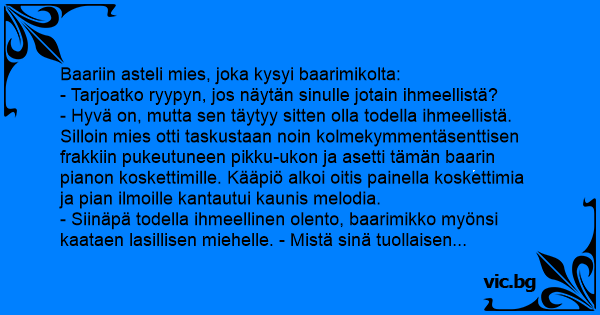 En man kom in på en bar med en liten väska som han öppnade. Ut kom en 30 cm lång pianist som satte sej och började spela på sitt medhavda piano. Bartendern frågade varifrån han hade fått tag på...