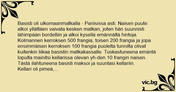 Basisti oli ulkomaanmatkalla - Pariisissa asti. Naisen puute alkoi yllättäen vaivata kesken matkan, joten hän suunnisti lähimpään bordelliin ja alkoi kysellä emännältä hintoja. Kolmannen kerroksen 500 frangia, toisen 200 frangia ja jopa ensimmäisen kerroksen 100 frangia puolelta tunnilta olivat kuitenkin liikaa basistin matkakassalle. Tuskastuneena emäntä lopulta mainitsi kellarissa olevan yh-den 10 frangin naisen. Tästä ilahtuneena basisti maksoi ja suuntasi kellariin.