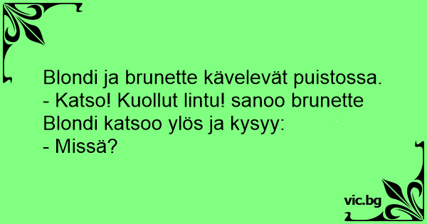 - Katso! Kuollut lintu! sanoo brunette Blondi katsoo ylös ja kysyy: