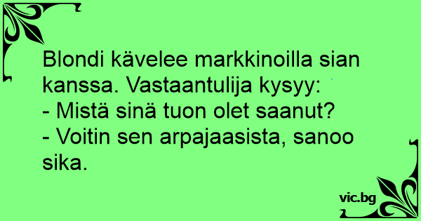 Blondi kävelee markkinoilla sian kanssa. Vastaantulija kysyy: