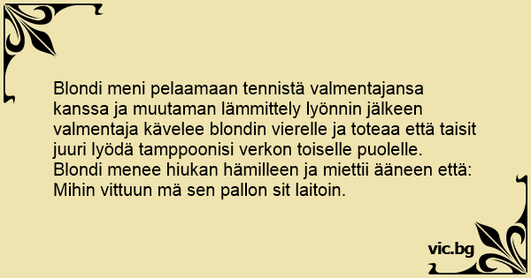 Blondi meni pelaamaan tennistä valmentajansa kanssa ja muutaman lämmittely lyönnin jälkeen valmentaja kävelee blondin vierelle ja toteaa että taisit juuri lyödä tamppoonisi verkon toiselle puolelle.