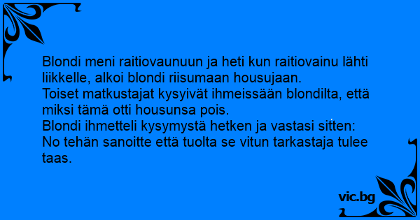 Blondi meni raitiovaunuun ja heti kun raitiovainu lähti liikkelle, alkoi blondi riisumaan housujaan. Toiset matkustajat kysyivät ihmeissään blondilta, että miksi tämä otti housunsa pois. Blondi ihmetteli kysymystä hetken ja vastasi sitten: No tehän sanoitte että tuolta se vitun tarkastaja tulee taas.