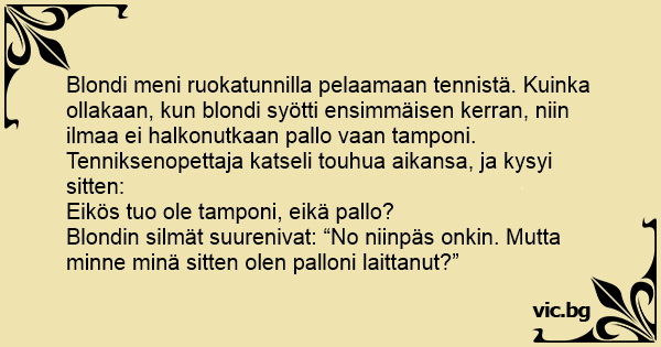 Blondi meni ruokatunnilla pelaamaan tennistä. Kuinka ollakaan, kun blondi syötti ensimmäisen kerran, niin ilmaa ei halkonutkaan pallo vaan tamponi.