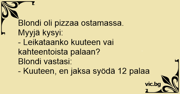 Blondýnka si objednala pizzu. Číšník se ptá: „Chcete ji rozřezat na šest, nebo na dvanáct kousků?” „Na šest,” odpoví rychle zákaznice. „Dvanáct bych jich nikdy nesnědla!”
