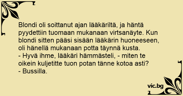 Blondi oli soittanut ajan lääkäriltä, ja häntä pyydettiin tuomaan mukanaan virtsanäyte. Kun blondi sitten pääsi sisään lääkärin huoneeseen, oli hänellä mukanaan ротта täynnä kusta.
