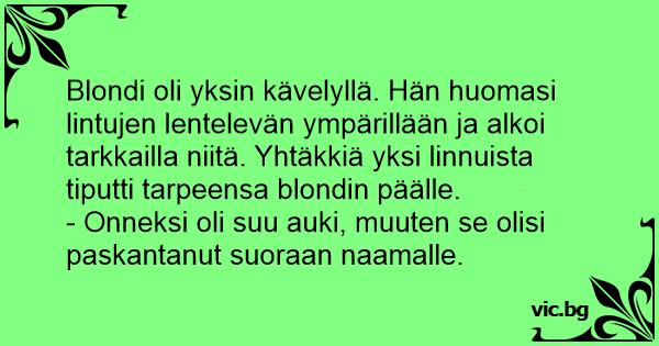 Blondi oli yksin kävelyllä. Hän huomasi lintujen lentelevän ympärillään ja alkoi tarkkailla niitä. Yhtäkkiä yksi linnuista tiputti tarpeensa blondin päälle.
