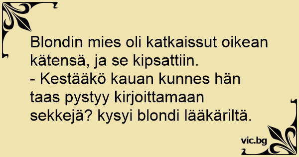 - Kestääkö kauan kunnes hän taas pystyy kirjoittamaan sekkejä? kysyi blondi lääkäriltä.