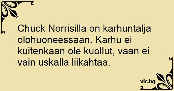 Chuck Norrisilla on karhuntalja olohuoneessaan. Karhu ei kuitenkaan ole kuollut, vaan ei vain uskalla liikahtaa.