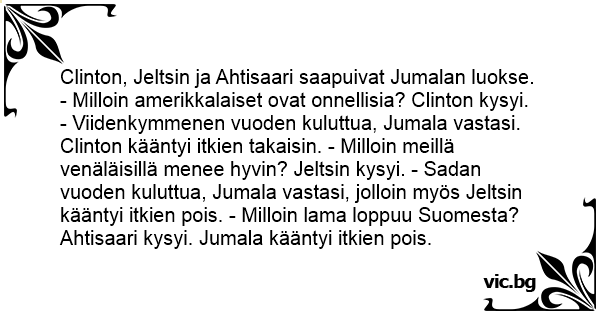 Clinton, Jeltsin ja Ahtisaari saapuivat Jumalan luokse. - Milloin amerikkalaiset ovat onnellisia? Clinton kysyi. - Viidenkymmenen vuoden kuluttua, Jumala vastasi. Clinton kääntyi itkien takaisin. - Milloin meillä venäläisillä menee hyvin? Jeltsin kysyi. - Sadan vuoden kuluttua, Jumala vastasi, jolloin myös Jeltsin kääntyi itkien pois. - Milloin lama loppuu Suomesta? Ahtisaari kysyi. Jumala kääntyi itkien pois.
