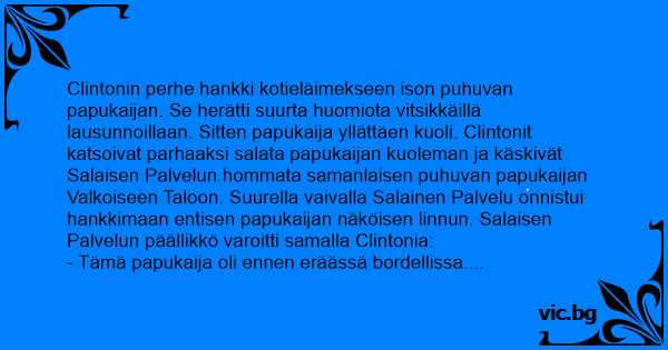 Clintonin perhe hankki kotieläimekseen ison puhuvan papukaijan. Se herätti suurta huomiota vitsikkäillä lausunnoillaan. Sitten papukaija yllättäen kuoli. Clintonit katsoivat parhaaksi salata papukaijan kuoleman ja käskivät Salaisen Palvelun hommata samanlaisen puhuvan papukaijan Valkoiseen Taloon. Suurella vaivalla Salainen Palvelu onnistui hankkimaan entisen papukaijan näköisen linnun. Salaisen Palvelun päällikkö varoitti samalla Clintonia: