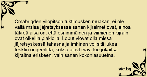 Cmabrigden yilopitson tuktimusken muakan, ei ole väilä msisä jäjretsyksessä sanan kijraimet ovat, ainoa täkreä aisa on, että esnimmäinen ja viimienen kijrain ovat oikelila piakiolla. Loput viovat olla missä jäjretsyskessä tahasna ja imhinen voi sitli lukea tesktin ongemlitta, koksa aiovt eiävt lue jokaitsa kijraitna eriskeen, vain sanan kokoniasuuetna.