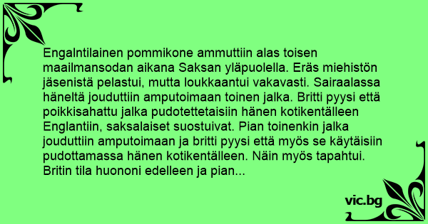 Engalntilainen pommikone ammuttiin alas toisen maailmansodan aikana Saksan yläpuolella. Eräs miehistön jäsenistä pelastui, mutta loukkaantui vakavasti. Sairaalassa häneltä jouduttiin amputoimaan toinen jalka. Britti pyysi että poikkisahattu jalka pudotettetaisiin hänen kotikentälleen Englantiin, saksalaiset suostuivat. Pian toinenkin jalka jouduttiin amputoimaan ja britti pyysi että myös se käytäisiin pudottamassa hänen kotikentälleen. Näin myös tapahtui. Britin tila huononi edelleen ja pian jouduttiin toinen käsi pistämään poikki. Jälleen britti pyysi, että käsi käytäisiin pudottamassa hänen kotikentälleen. Nyt saksalaiset sanoivat: