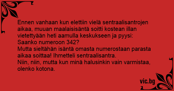 Ennen vanhaan kun elettiin vielä sentraalisantrojen aikaa, muuan maalaisisäntä soitti kostean illan vietettyään heti aamulla keskukseen ja pyysi: