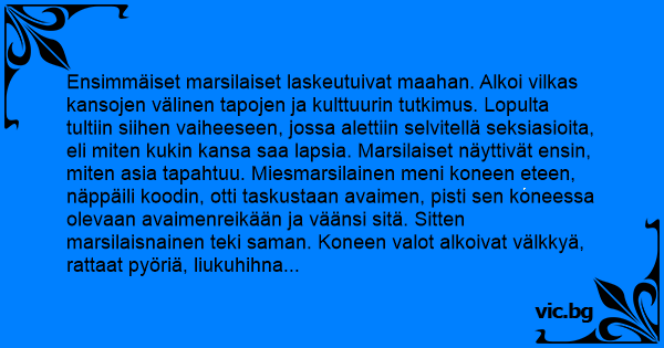 Ensimmäiset marsilaiset laskeutuivat maahan. Alkoi vilkas kansojen välinen tapojen ja kulttuurin tutkimus. Lopulta tultiin siihen vaiheeseen, jossa alettiin selvitellä seksiasioita, eli miten kukin kansa saa lapsia. Marsilaiset näyttivät ensin, miten asia tapahtuu. Miesmarsilainen meni koneen eteen, näppäili koodin, otti taskustaan avaimen, pisti sen koneessa olevaan avaimenreikään ja väänsi sitä. Sitten marsilaisnainen teki saman. Koneen valot alkoivat välkkyä, rattaat pyöriä, liukuhihna kulkea ja sähkökipinät räiskyä. Viiden minuutin kuluttua koneesta työntyi taso, jolla oli pieni itkevä marsilaislapsi. Sitten tuli maan asukkaiden vuoro selittää. Punastellen delegaation johtaja vei marsilaiset katsomaan, miten delegaatioon kuuluva aviopari rakasteli sängyssä ja selitti, että sitten yhdeksän kuukauden päästä syntyy uusi ihminen. Marsilaiset alkoivat selityksen jälkeen nauraa oikein sydämellisesti. Kun maan delegaation johtaja kysyi syytä tähän yllättävään iloon, marsilaiset selittivät:
