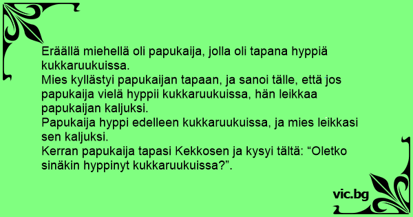Kerran papukaija tapasi Kekkosen ja kysyi tältä: “Oletko sinäkin hyppinyt kukkaruukuissa?”.