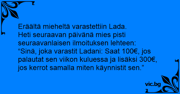 “Sinä, joka varastit Ladani: Saat 100€, jos palautat sen viikon kuluessa ja lisäksi 300€, jos kerrot samalla miten käynnistit sen.”
