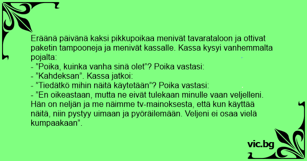 Eräänä päivänä kaksi pikkupoikaa menivät tavarataloon ja ottivat paketin tampooneja ja menivät kassalle. Kassa kysyi vanhemmalta pojalta: