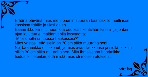 No, baarimikko ei uskonut, ja mies avasi laukkunsa ja siellä oli kuin olikin 30 cm pitkä muurahainen. Siitä ihmeissään baarimikko tiedusteli tietenkin, että mistä mies oli moisen otuksen saanut?