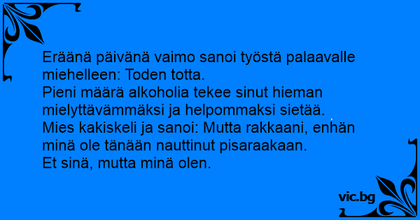 Eräänä päivänä vaimo sanoi työstä palaavalle miehelleen: Toden totta.