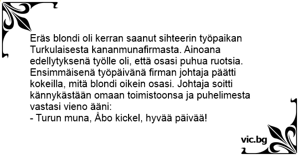 Eräs blondi oli kerran saanut sihteerin työpaikan Turkulaisesta kananmunafirmasta. Ainoana edellytyksenä työlle oli, että osasi puhua ruotsia. Ensimmäisenä työpäivänä firman johtaja päätti kokeilla, mitä blondi oikein osasi. Johtaja soitti kännykästään omaan toimistoonsa ja puhelimesta vastasi vieno ääni: