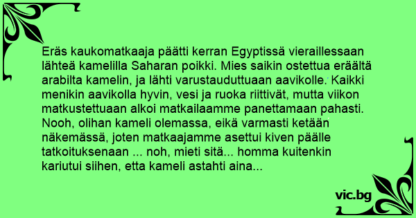 Eräs kaukomatkaaja päätti kerran Egyptissä vieraillessaan lähteä kamelilla Saharan poikki. Mies saikin ostettua eräältä arabilta kamelin, ja lähti varustauduttuaan aavikolle. Kaikki menikin aavikolla hyvin, vesi ja ruoka riittivät, mutta viikon matkustettuaan alkoi matkailaamme panettamaan pahasti. Nooh, olihan kameli olemassa, eikä varmasti ketään näkemässä, joten matkaajamme asettui kiven päälle tatkoituksenaan ... noh, mieti sitä... homma kuitenkin kariutui siihen, etta kameli astahti aina askeleen eteenpäin kun mies... krmhöööm, tiedät kyllä. Turhautuneena mies lopetti yrityksensä, ja jatkoi matkaansa. Paineet kuitenkin kohosivat...