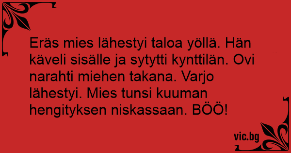 Eräs mies lähestyi taloa yöllä. Hän käveli sisälle ja sytytti kynttilän. Ovi narahti miehen takana. Varjo lähestyi. Mies tunsi kuuman hengityksen niskassaan. BÖÖ!