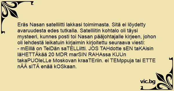 Eräs Nasan satelliitti lakkasi toimimasta. Sitä ei löydetty avaruudesta edes tutkalla. Satelliitin kohtalo oli täysi mysteeri, kunnes posti toi Nasan pääjohtajalle kirjeen, johon oli lehdestä leikatuin kirjaimin kirjoitettu seuraava viesti: