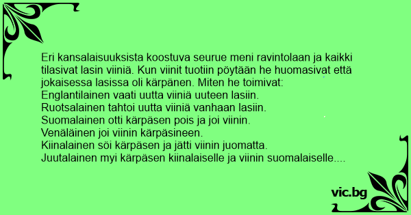 Eri kansalaisuuksista koostuva seurue meni ravintolaan ja kaikki tilasivat lasin viiniä. Kun viinit tuotiin pöytään he huomasivat että jokaisessa lasissa oli kärpänen. Miten he toimivat: