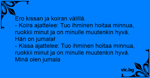 - Koira ajattelee: Tuo ihminen hoitaa minnua, ruokkii minut ja on minulle muutenkin hyvä. Hän on jumala!