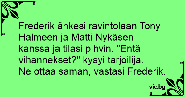 Frederik änkesi ravintolaan Tony Halmeen ja Matti Nykäsen kanssa ja tilasi pihvin. "Entä vihannekset?" kysyi tarjoilija.