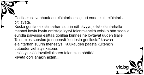 Koska gorilla oli eläintarhan suurin nähtävyys, eikä eläintarhalla mennyt kovin hyvin omistaja kysyi talonmieheltä voisiko hän sadalla eurolla päivässä esittää gorillaa kunnes he löytävät uuden tilalle.