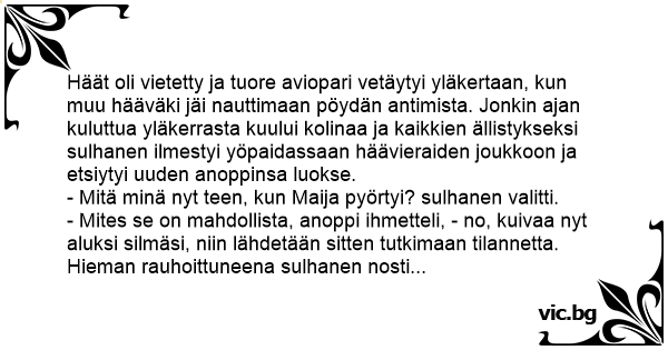 - Mites se on mahdollista, anoppi ihmetteli, - no, kuivaa nyt aluksi silmäsi, niin lähdetään sitten tutkimaan tilannetta.