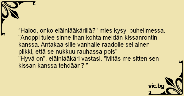 ”Haloo, onko eläinlääkärillä?" mies kysyi puhelimessa.