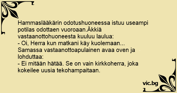 Hammaslääkärin odotushuoneessa istuu useampi potilas odottaen vuoroaan.Äkkiä vastaanottohuoneesta kuuluu laulua: