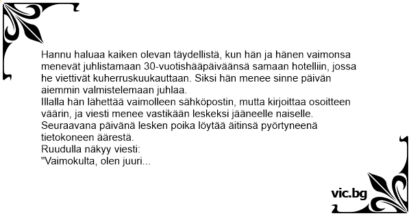 Zur Feier ihres 30. Hochzeitstages planen Hannu und seine Frau eine Reise in das Hotel, in dem sie einst ihre Flitterwochen verbracht haben. Alles soll perfekt sein. Hannu fährt einen Tag früher, um alles vorzubereiten. Nachts schreibt er eine E-Mail an seine Frau, gibt jedoch eine falsche...