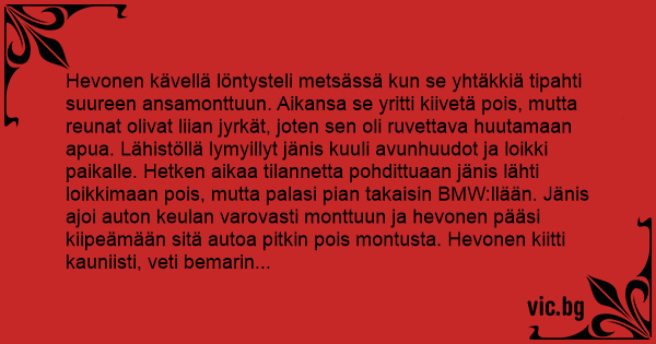 Hevonen kävellä löntysteli metsässä kun se yhtäkkiä tipahti suureen ansamonttuun. Aikansa se yritti kiivetä pois, mutta reunat olivat liian jyrkät, joten sen oli ruvettava huutamaan apua. Lähistöllä lymyillyt jänis kuuli avunhuudot ja loikki paikalle. Hetken aikaa tilannetta pohdittuaan jänis lähti loikkimaan pois, mutta palasi pian takaisin BMW:llään. Jänis ajoi auton keulan varovasti monttuun ja hevonen pääsi kiipeämään sitä autoa pitkin pois montusta. Hevonen kiitti kauniisti, veti bemarin pois montusta ja lähti jatkamaan matkaa. Hevonen oli hädin tuskin ehtinyt seuraavan puskan taakse, kun se jo kuuli riipaisevia avunhuutoja. Niinpä se kääntyi takaisin ja palasi kuopalle. Kuinka ollakkaan, jänishän se oli sinne samaiseen monttuun pudonnut uteliaisuuttaan. Hetkeäkään epäröimättä hevonen laski ison jortikkansa monttuun ja jänis pääsi kiipeämään sitä pitkin pois... Mikä on tarinan opetus?