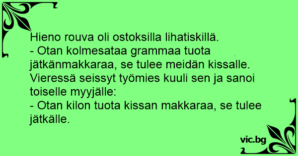 - Otan kolmesataa grammaa tuota jätkänmakkaraa, se tulee meidän kissalle.