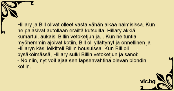 Hillary ja Bill olivat olleet vasta vähän aikaa naimisissa. Kun he palasivat autollaan eräiltä kutsuilta, Hillary äkkiä kumartui, aukaisi Billin vetoketjun ja... Kun he tuntia myöhemmin ajoivat kotiin, Bill oli yllättynyt ja onnellinen ja Hillaryn käsi leikitteli Billin housuissa. Kun Bill oli pysäköimässä, Hillary sulki Billin vetoketjun ja sanoi: