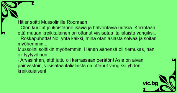 - Arvasinhan, että juttu oli kerrassaan perätön! Asia on aivan päinvastoin, viisisataa italialaista on ottanut vangiksi yhden kreikkalaisen!