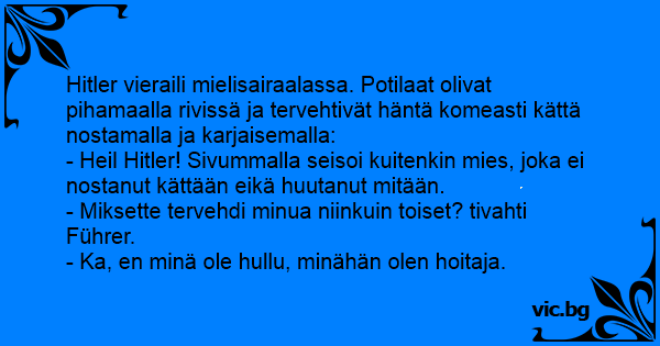 Нiтlеr vieraili mielisairaalassa. Potilaat olivat pihamaalla rivissä ja tervehtivät häntä komeasti kättä nostamalla ja karjaisemalla: