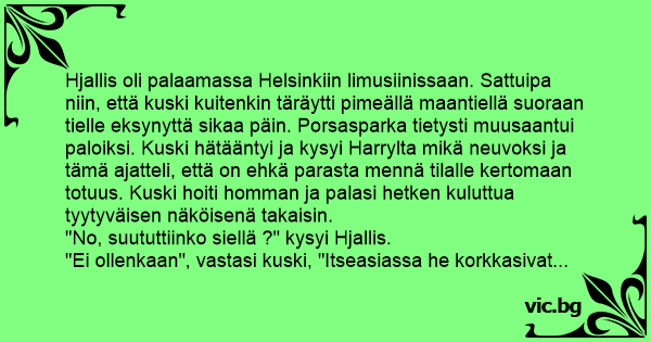 "Juuri mitä pyysit", vastasi kuski, "Sanoin, että: Olen Harry Harkimon autonkuljettaja ja tapoin sen sian"