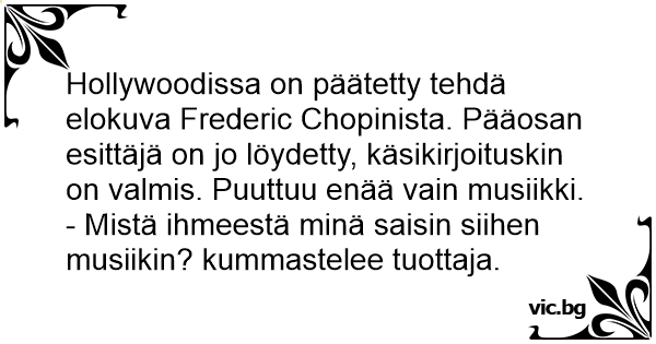 Hollywoodissa on päätetty tehdä elokuva Frederic Chopinista. Pääosan esittäjä on jo löydetty, käsikirjoituskin on valmis. Puuttuu enää vain musiikki.