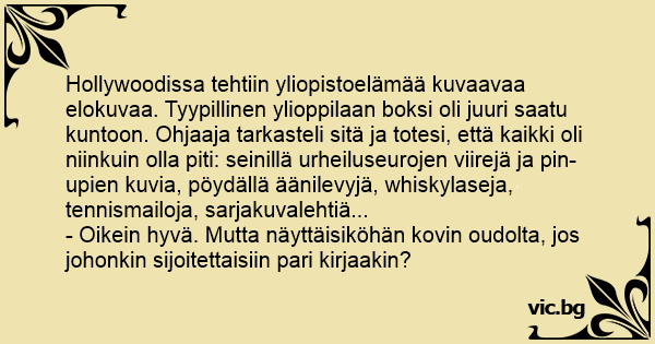 Hollywoodissa tehtiin yliopistoelämää kuvaavaa elokuvaa. Tyypillinen ylioppilaan boksi oli juuri saatu kuntoon. Ohjaaja tarkasteli sitä ja totesi, että kaikki oli niinkuin olla piti: seinillä urheiluseurojen viirejä ja pin-upien kuvia, pöydällä äänilevyjä, whiskylaseja, tennismailoja, sarjakuvalehtiä...