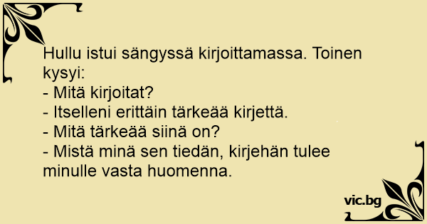 Hullu istui sängyssä kirjoittamassa. Toinen kysyi: