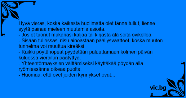 Hyvä vieras, koska kaikesta huolimatta olet tänne tullut, lienee syytä painaa mieleen muutamia asioita: