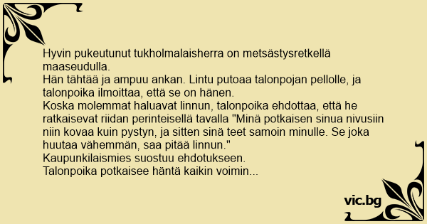 Koska molemmat haluavat linnun, talonpoika ehdottaa, että he ratkaisevat riidan perinteisellä tavalla "Minä potkaisen sinua nivusiin niin kovaa kuin pystyn, ja sitten sinä teet samoin minulle. Se joka huutaa vähemmän, saa pitää linnun."